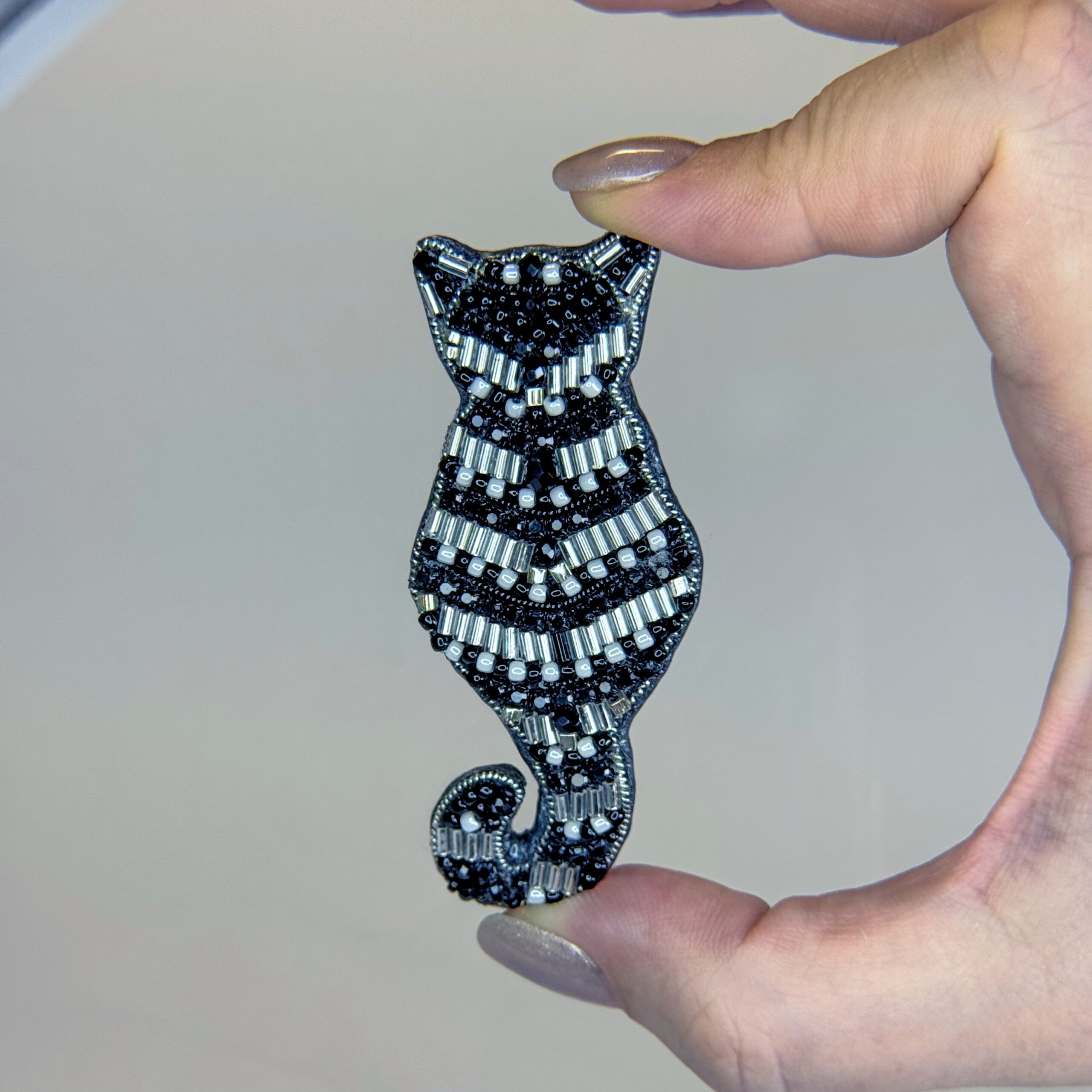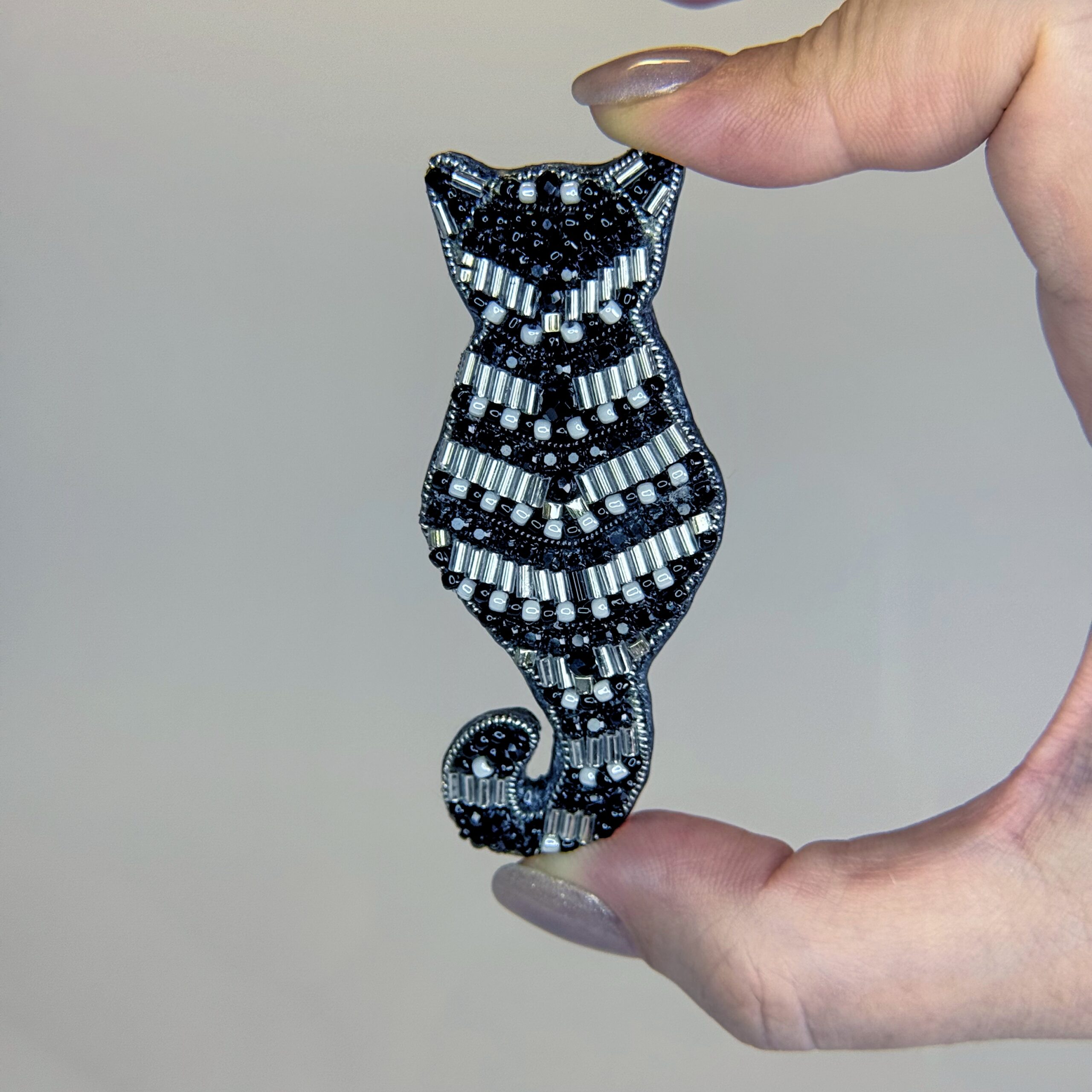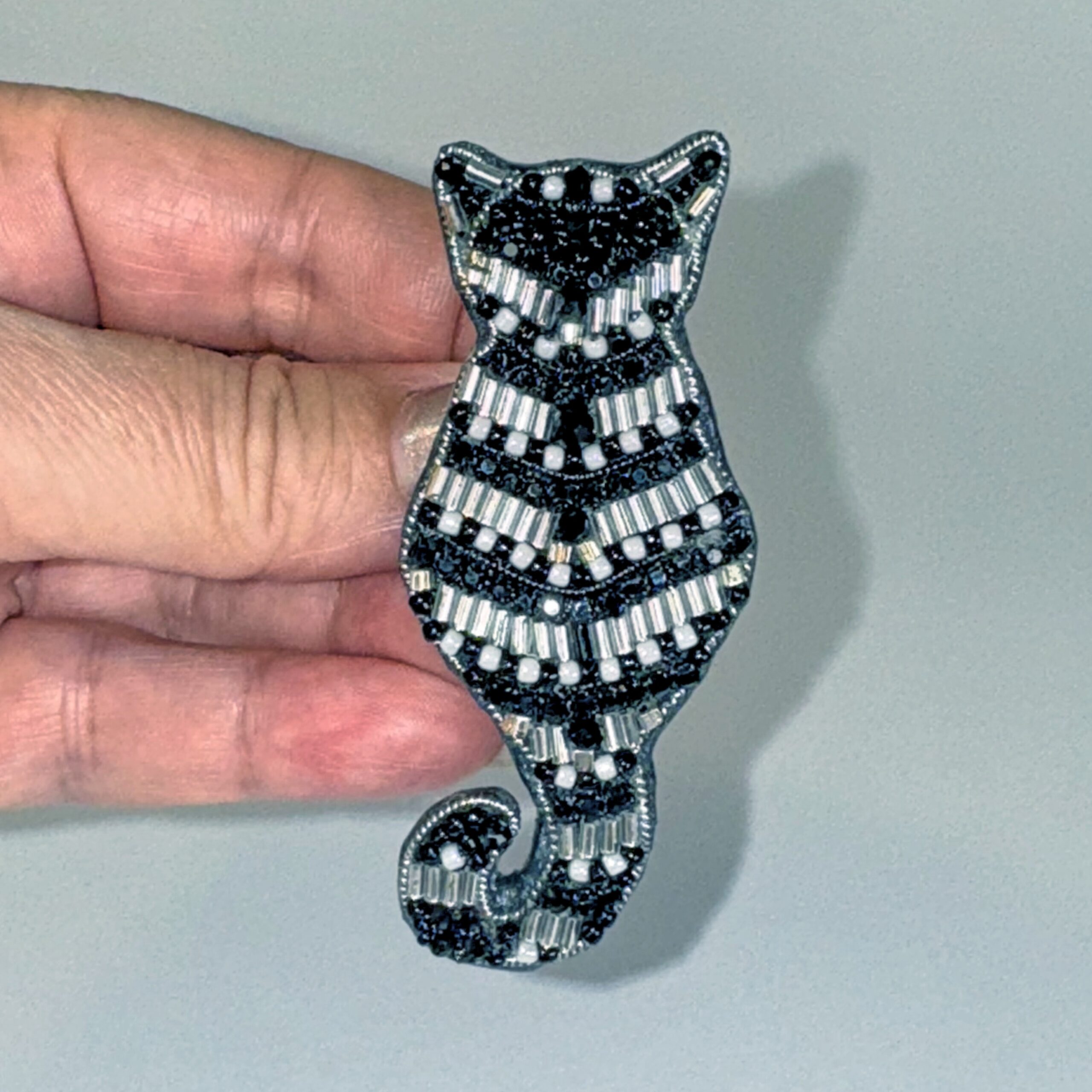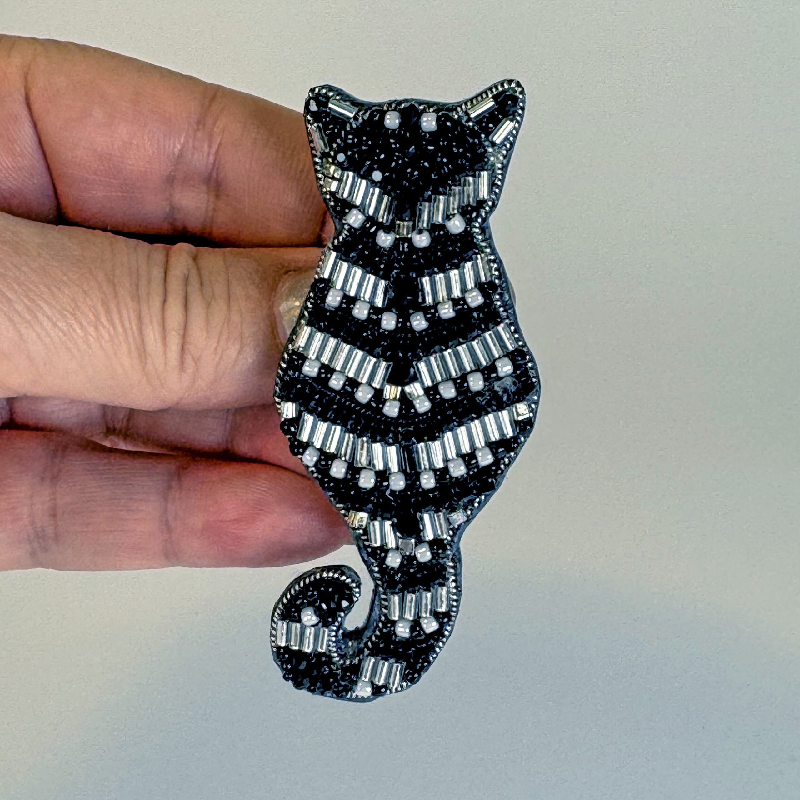 Sleek, tall, and unmistakably elegant — this handcrafted cat brooch captures a long-bodied feline in a graceful sitting pose viewed from behind. The entire silhouette is covered with alternating rows of jet-black seed beads and gleaming silver bugle beads, creating a striking striped coat that catches the light beautifully. Taller and more imposing than its smaller counterpart, this brooch makes a bold statement on any outfit.