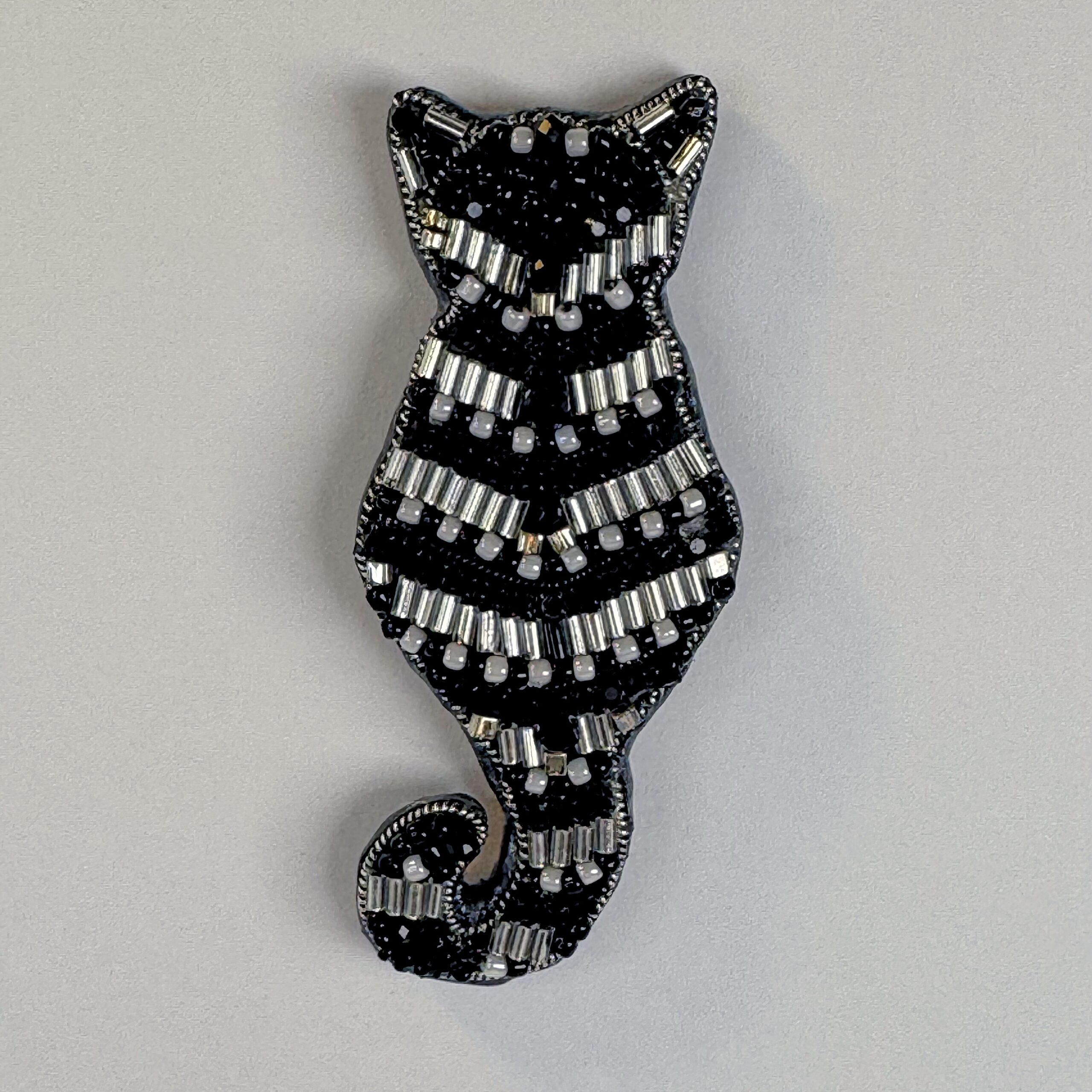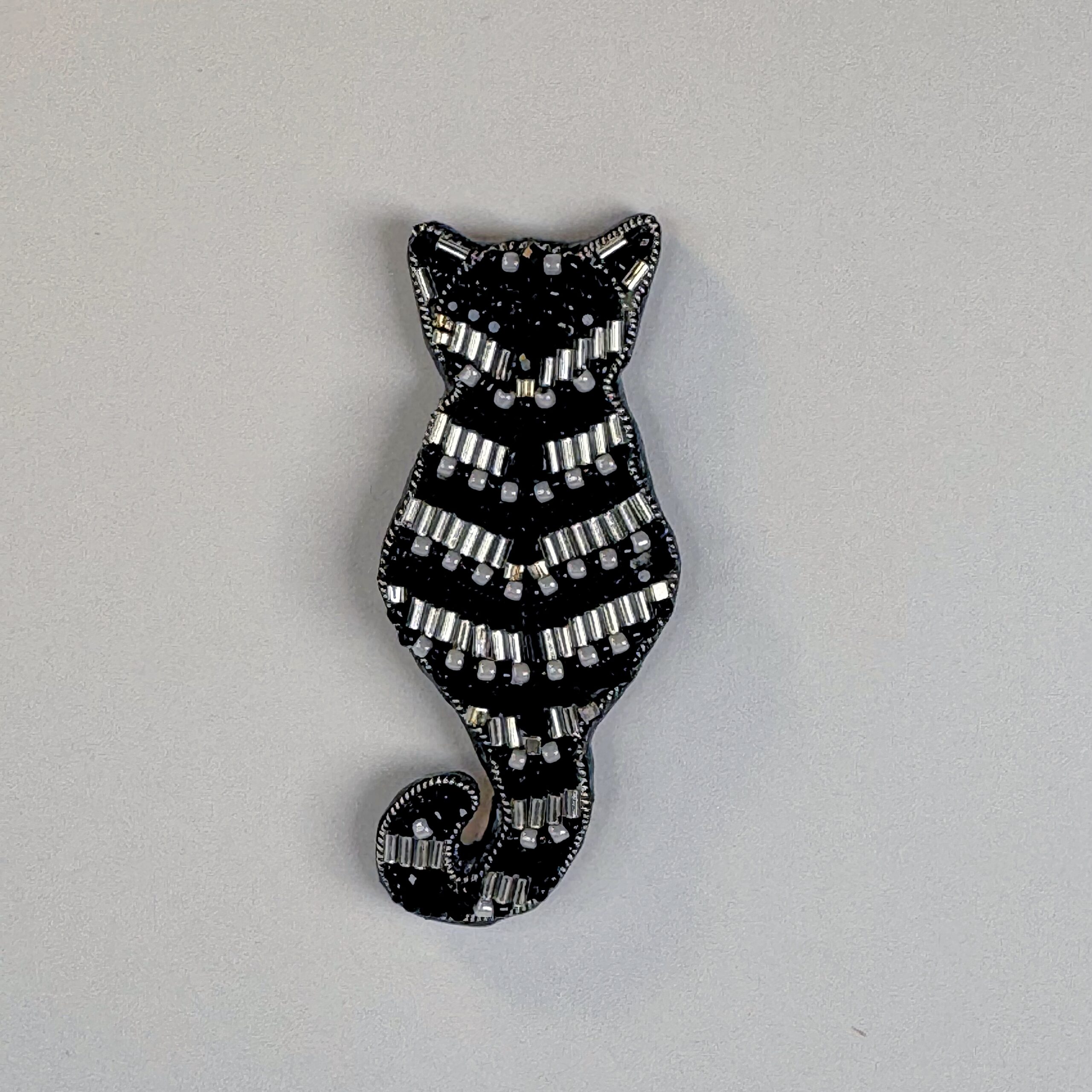 Black Silver Striped Cat Brooch Tall, Beaded Cat Silhouette Pin, Handmade Animal Jewelry, Unique Cat Lover Gift — lifestyle photo