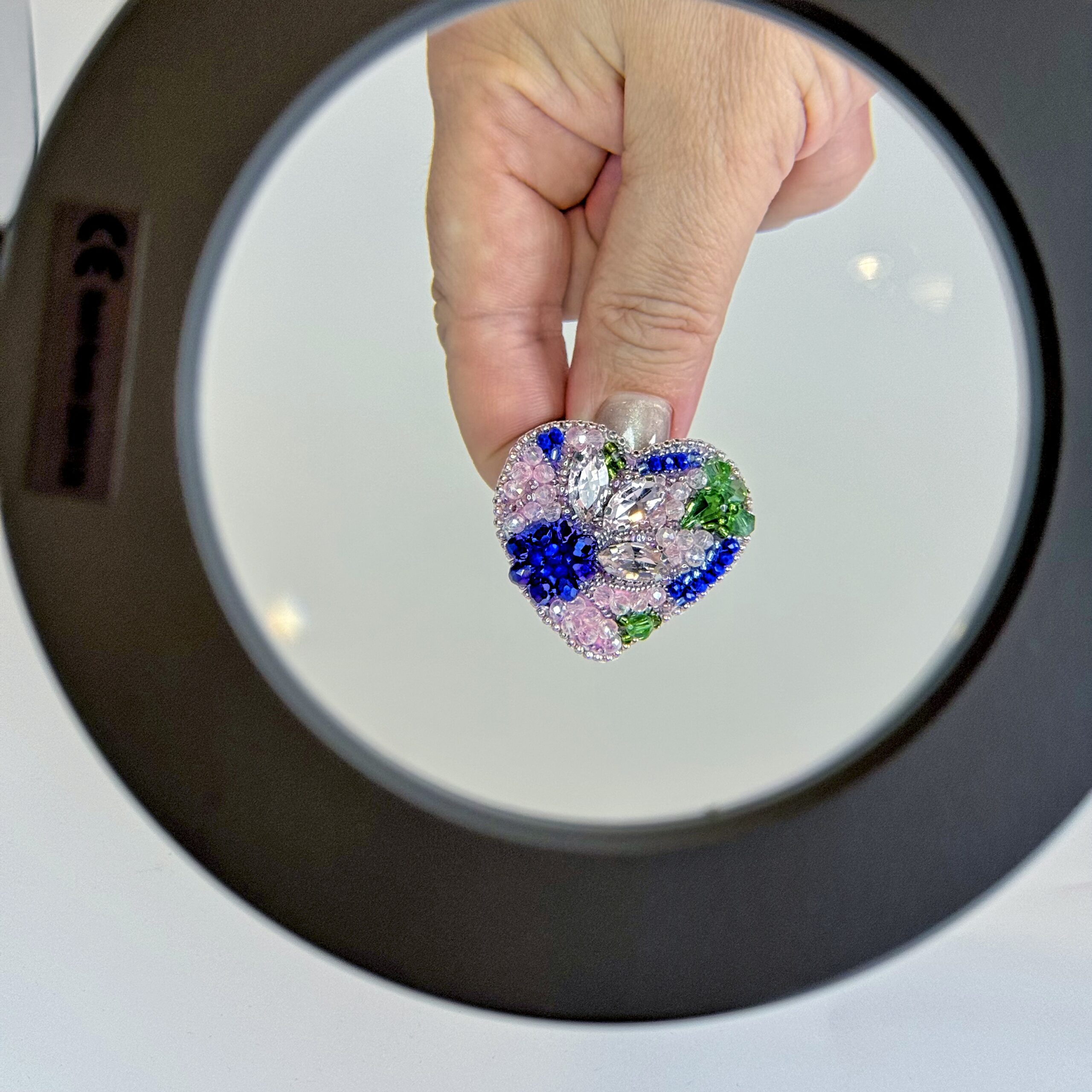 Cool, sophisticated, and brilliantly sparkly — this blue and silver heart brooch is a celebration of crystal elegance. Pointed marquise clear crystals fan across the surface in a dramatic arrangement, while blue faceted glass beads provide a cool sapphire accent. Fine silver and grey seed beads fill the spaces between, creating a shimmering, icy palette that evokes winter starlight. A polished silver canitel edge completes this refined piece.