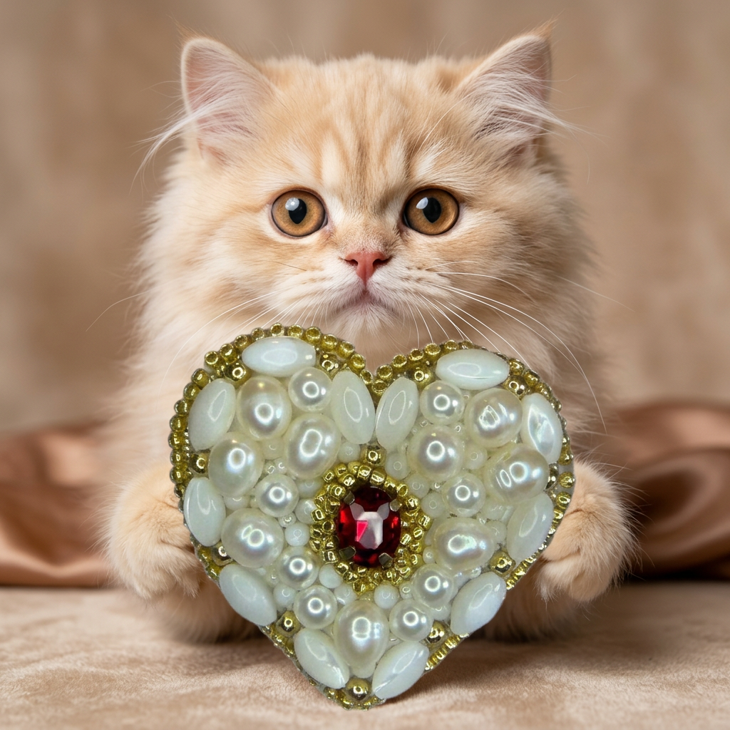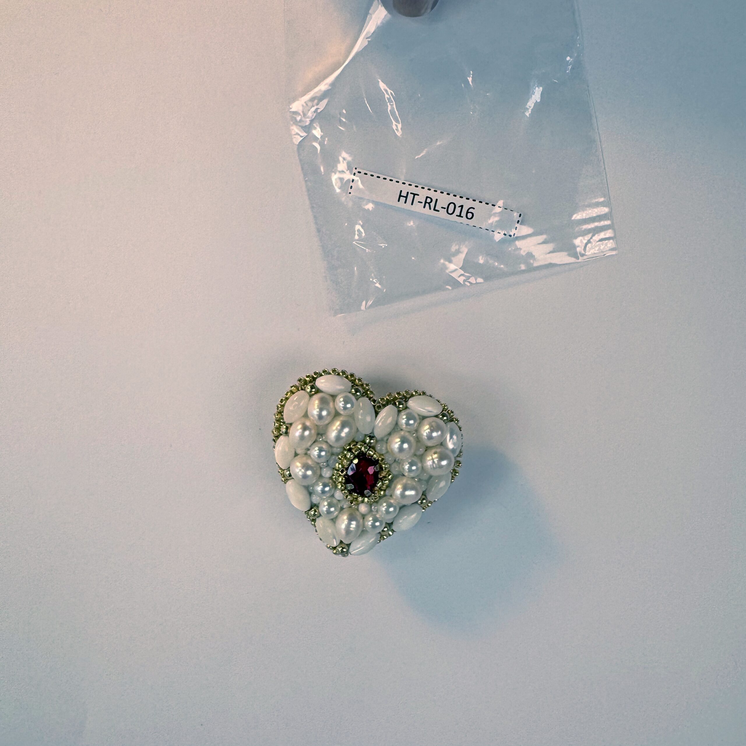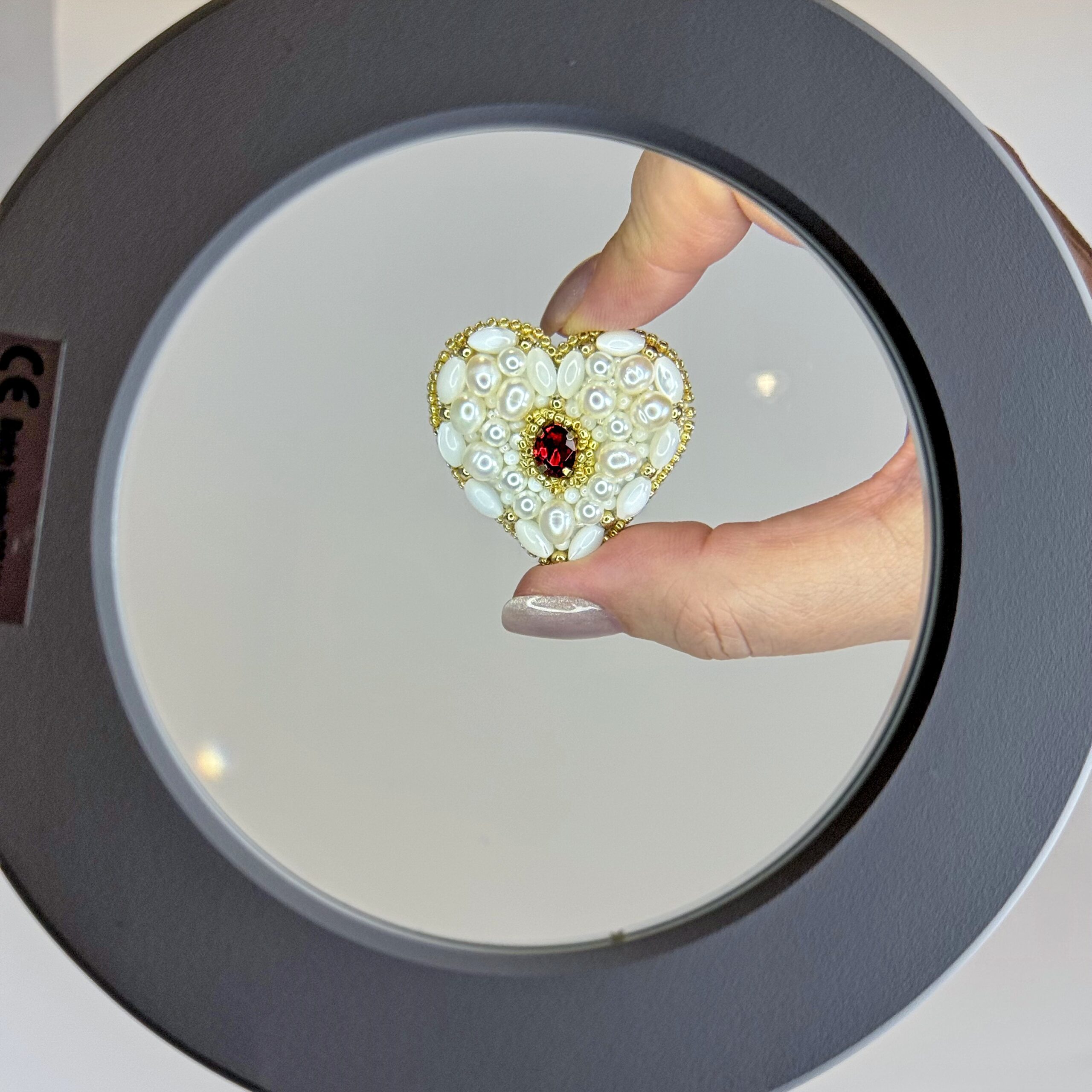 Pure elegance in the shape of a heart. This luxurious handcrafted brooch is a celebration of natural beauty — the entire surface blooms with a rich combination of natural freshwater pearls, oval mother-of-pearl beads, and artificial pearls in creamy ivory and warm white tones. Warm gold seed beads weave between the pearls, adding a radiant, sun-kissed glow. At the very center rests a single deep red crystal — a breathtaking focal point that evokes passion and romance. This is not merely jewelry; it is a small work of art for the modern romantic.