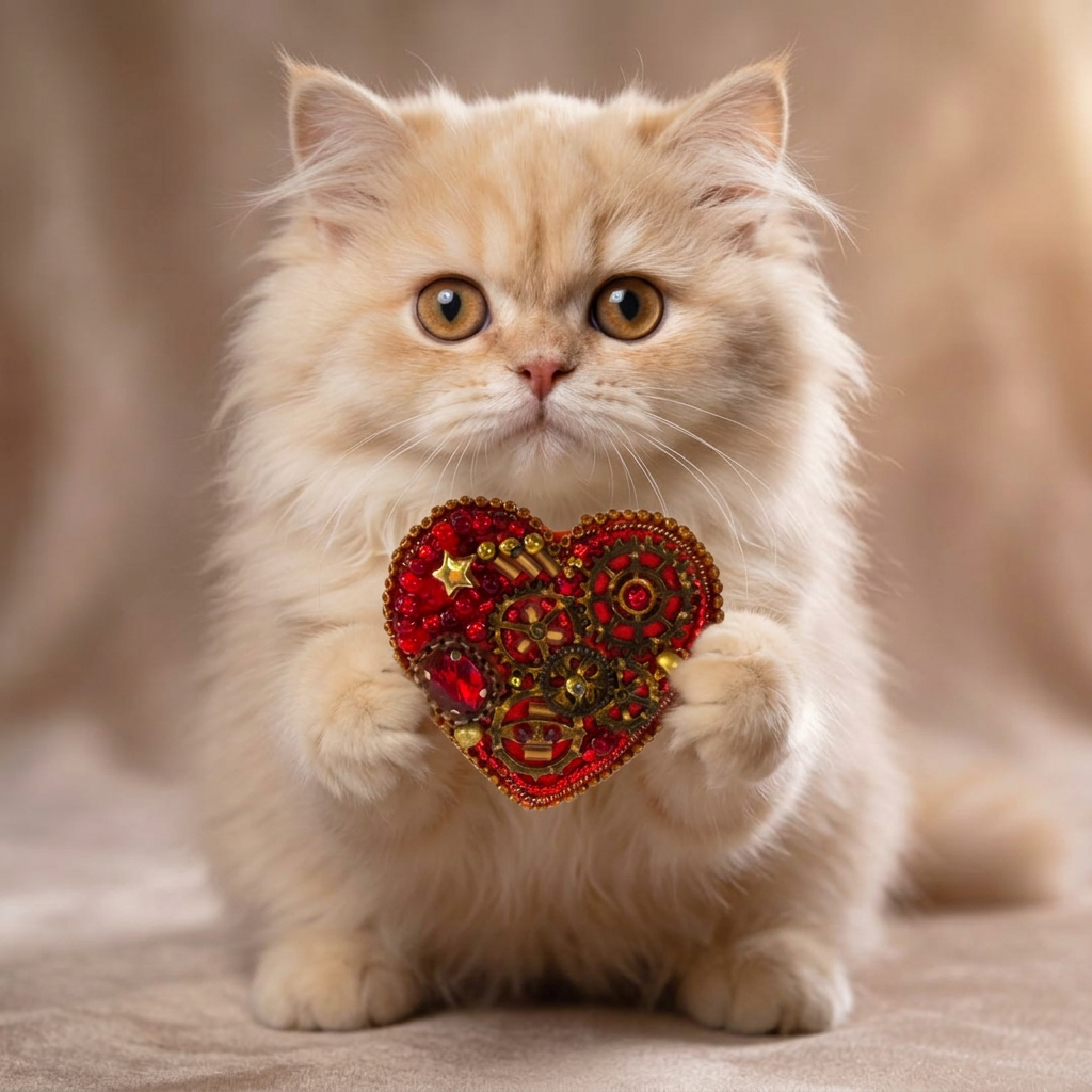 Where passion meets precision — this extraordinary steampunk heart brooch merges the romance of red with the intrigue of bronze clockwork machinery. Bronze and gold clock gears are artfully arranged across the heart surface, surrounded by deep red glass beads that pulse like a mechanical heartbeat. A red faceted crystal catches the light at the center, while gold star beads add a celestial sparkle. A truly unique conversation piece.