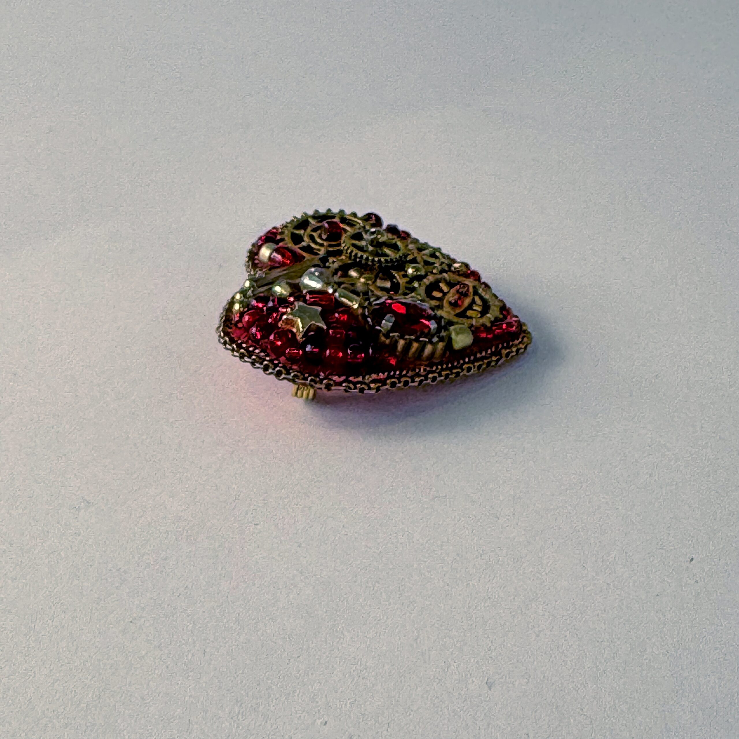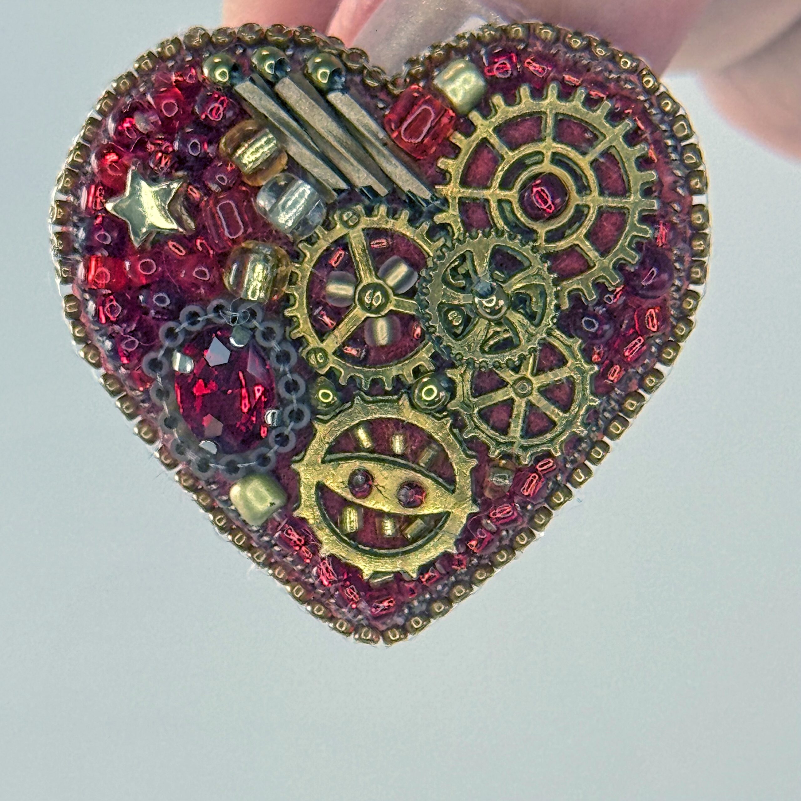The most gem-accented of the steampunk hearts — this red mechanical heart combines bronze clock gears with a sparkling red faceted crystal, gold star beads, and red bugle bead background.