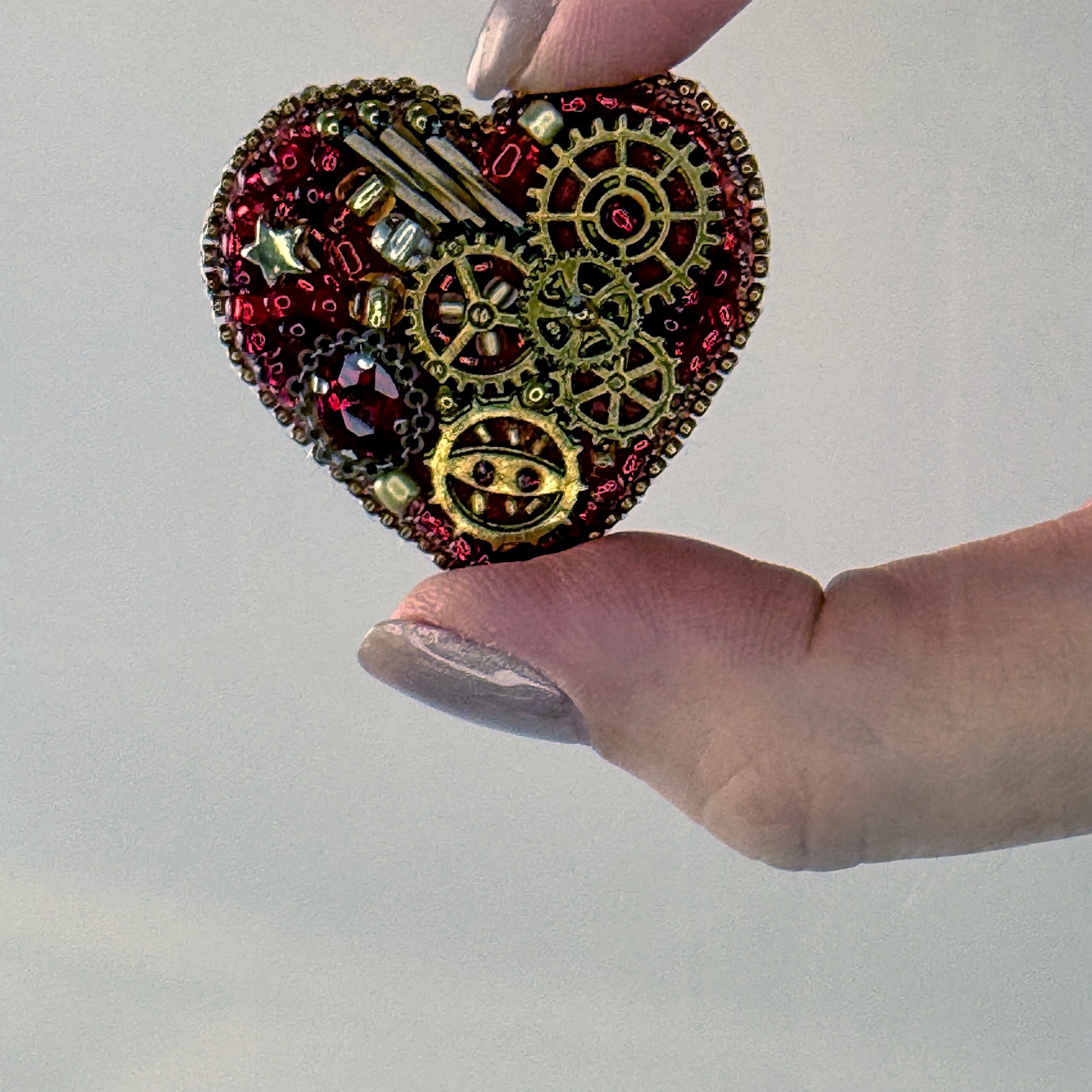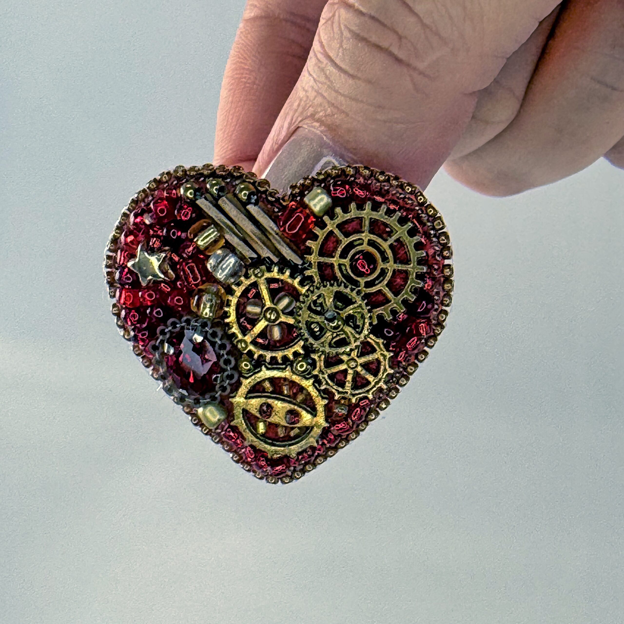The most gem-accented of the steampunk hearts — this red mechanical heart combines bronze clock gears with a sparkling red faceted crystal, gold star beads, and red bugle bead background. The crystal adds a precious, sparkling dimension to the industrial gear composition, bridging the gap between Victorian clockwork and fine jewelry aesthetics. A complex and layered piece that rewards close inspection.